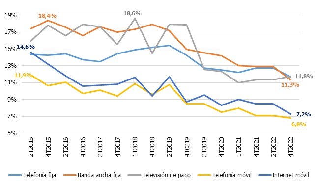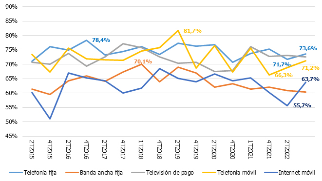 - La permanente cuestión sobre los precios: se detecta un repunte en la percepción de que nuestros servicios son caros (curiosamente, antes de la generalizada subida de tarifas de inicios de 2023). La Internet móvil ha aumentado esta idea de servicio caro un 8, mientras tanto la telefonía fija como la móvil ha incrementado la percepción de productos costosos alrededor de dos puntos porcentuales: