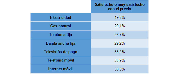- No obstante, y a pesar de que casi 7 de cada 10 usuarios de telecomunicaciones se quejan de que son “servicios caros”, aproximadamente 3 de cada 10 de dichos usuarios se describen como “satisfechos” o “muy satisfechos” con el precio de sus servicios, con una Internet móvil que llega hasta el 38% de satisfacción. En el lado opuesto, la energía casi ni alcanza el 20% de alta satisfacción.