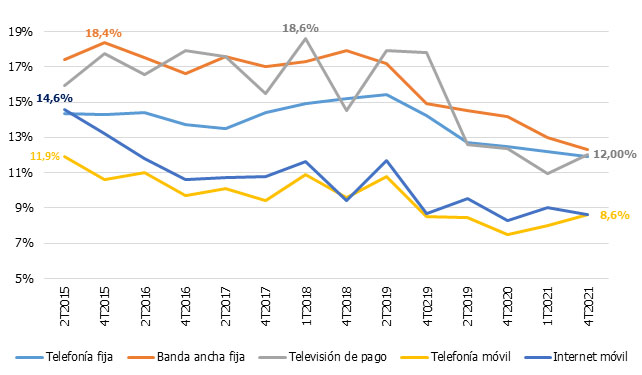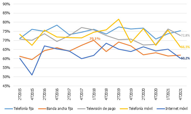 - Aunque se observa un cierto repute entre los dos semestres de 2021 en la insatisfacción de la TV de pago y de la telefonía móvil, lo cierto es que los índices están en su mínimo histórico, lo que demuestra la buena calidad de los servicios que presta nuestro sector.